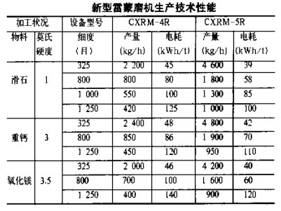 我們的實踐與探索。這種新型的超細雷蒙磨機在國內(nèi)許多廠家進行了生產(chǎn)運行,從加工滑石粉、方解石、氧化鎂等廠家二年多來的運行情況看,證實了其效率高節(jié)能的技術(shù)性能和良好的經(jīng)濟指標(見下表)。