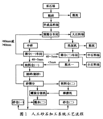 系統(tǒng)由進料回車場、粗碎車間、中碎車間、細碎車間、棒磨車間、預篩分車間、篩分(一)車間、篩分(二)車間、砂篩分車間、半成品料倉、轉(zhuǎn)料倉、成品料倉、水處理系統(tǒng)、電控系統(tǒng)、供水供電系統(tǒng)及場內(nèi)公路等組成。其工藝流程見圖1。