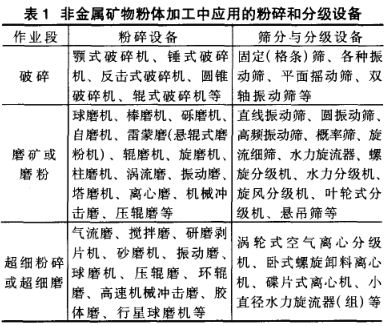 目前,非金屬礦物的粉碎加工根據(jù)產(chǎn)品的粒度大小大體分為:破碎(產(chǎn)物粒度35~1mm)、磨礦或磨粉(產(chǎn)物粒度1000~10m)及超細(xì)粉碎或超細(xì)磨(產(chǎn)物粒度10~0.1m)3個(gè)層次。各個(gè)不同粉碎和分級(jí)層次所應(yīng)用的主要工業(yè)設(shè)備列于表1。