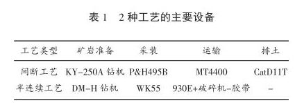 我國北方某露天煤礦,年產(chǎn)量達(dá)到30.00Mt,平均剝采比為3.85m3/t,年推進(jìn)度達(dá)到400m,所采用的礦山設(shè)備均為大型、重載、高生產(chǎn)能力的設(shè)備,該礦包含的工藝系統(tǒng)主要有2種,表土及巖石覆蓋層采用單斗-卡車間斷工藝,煤層開采則采用半連續(xù)工藝,這2種工藝所采用的主要設(shè)備見表1。