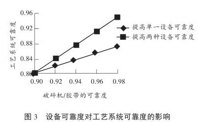 根據(jù)分析確定半連續(xù)工藝的運輸環(huán)節(jié)為薄弱環(huán)節(jié),進(jìn)行了相應(yīng)的優(yōu)化研究,當(dāng)單獨提高破碎機或者膠帶的設(shè)備可靠度至0.96,或者同時提升破碎機或者膠帶的設(shè)備可靠度至0.93,可實現(xiàn)其工藝系統(tǒng)可靠度達(dá)到優(yōu)秀水平。