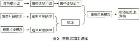 主機(jī)架加工特點(diǎn)為:結(jié)構(gòu)件尺寸較大,板件厚度較??;焊接變形量較大,安裝尺寸關(guān)聯(lián)性強(qiáng);專用拼焊工裝尺寸較大,制作周期長(zhǎng)、成本高、難度大。主機(jī)架加工路線如圖2所示。