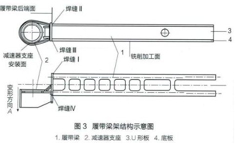 履帶梁與減速器支座拼焊時(shí),應(yīng)以履帶梁中線為基準(zhǔn),以使減速器支座安裝面與履帶梁中線平行度≤1mm,同時(shí)保證減速器支座安裝面與履帶梁底板的垂直度≤1mm。具體結(jié)構(gòu)見(jiàn)圖3。