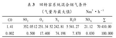 回轉(zhuǎn)窯生產(chǎn)系統(tǒng)混合煙氣(煙氣條件見下表3)經(jīng)脫硫引風(fēng)機(jī)輸送至氧化鋅脫硫系統(tǒng),回轉(zhuǎn)窯系統(tǒng)混合煙氣溫度93~120℃、煙氣壓力為0.310Pa。