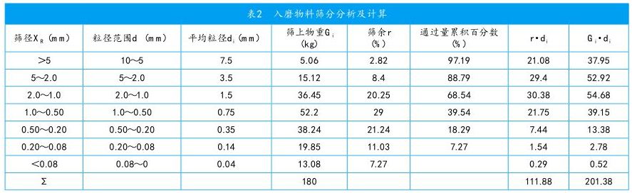 (1)作入磨物料篩分分析。取有代表性的入磨物料樣,作入磨物料的篩析,從中求出:“通過累積百分數(shù)的粒徑大小”或“任意粒徑大小的累積百分數(shù)”。然后,計算出平均粒徑,示例見表2。
