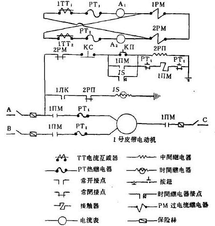 1PM過電流(超負荷)繼電器是控制圓錐破碎機的,定為350安培延時20秒跳閘;2PM控制圓錐破碎機的給礦皮帶,定為250安培延時15秒使給礦皮帶停車。這兩個過電流繼電器相串聯(lián)。JS時間繼電器是控制給礦皮帶自動恢復給礦的。