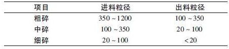 根據(jù)破碎前后石料粒徑的大小,破碎可分為粗碎、中碎和細(xì)碎3段,各段破碎的粒徑范圍見下表。