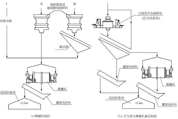 (1)制砂工藝。早期的制砂工藝通常是在細(xì)碎或超細(xì)碎工序完成后,采用制砂設(shè)備進(jìn)行磨砂,常用的細(xì)碎和超細(xì)碎設(shè)備是細(xì)腔型圓錐破碎機(jī),磨砂設(shè)備主要選用棒磨機(jī)和球磨機(jī)。近年來,隨著制砂技術(shù)的不斷進(jìn)步,發(fā)展較快的制砂工藝是立軸式?jīng)_擊破碎機(jī)和棒磨機(jī)聯(lián)合制砂工藝,由于立軸式?jīng)_擊破碎機(jī)制砂具有成本低,砂子質(zhì)量穩(wěn)定的特點(diǎn),棒磨機(jī)制砂具有工藝穩(wěn)定、成熟的特點(diǎn)。因此,聯(lián)合制砂工藝得到了業(yè)內(nèi)的認(rèn)可,廣泛應(yīng)用在各大砂石加工廠。
