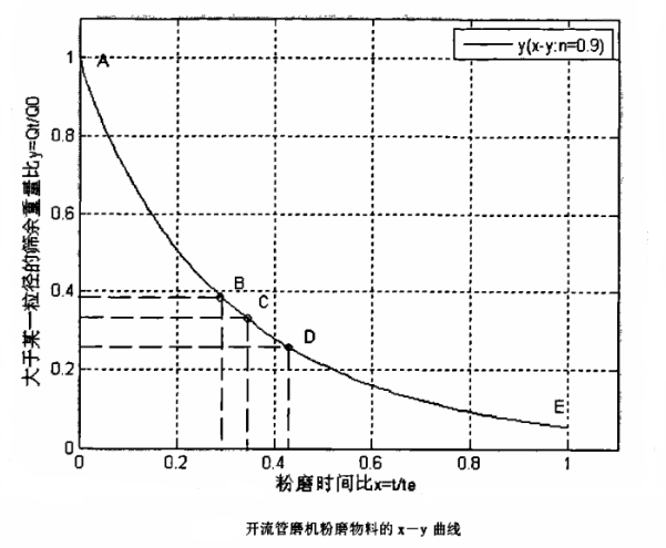 隔倉板位置處的t與te的比值x,可根據(jù)右式計算:,n是在一定條件下的粉磨速度指數(shù),在0-1之間取值;k是在一定條件下的粉磨速度指數(shù);S是隔倉裝置處的斜率值。