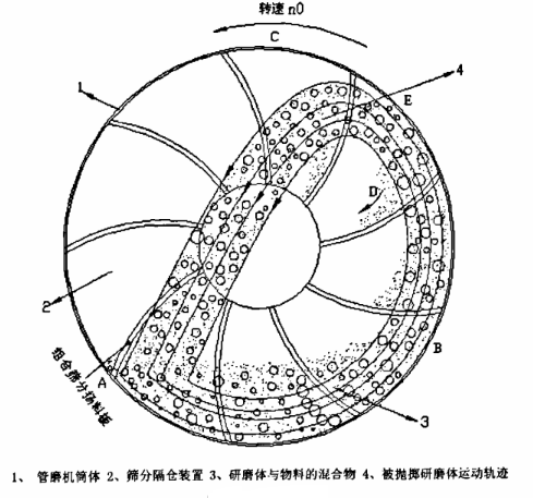 A是物料和研磨體的拋落點,在此處隔倉裝置剛剛接觸料面,物料開始進(jìn)入裝置內(nèi)得以被篩分,C點是物料對篩板面的壓力作用完全消失點。因此A處是篩分作用的起始點,C點是篩分作用的終點。