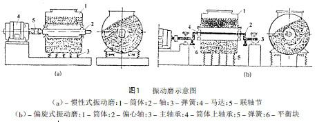 圖1為慣性式和偏旋式振動(dòng)磨機(jī)的示意圖。
