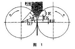 物料通過(guò)輥壓機(jī)的進(jìn)料裝置形成料柱后的破碎分三個(gè)區(qū)域。